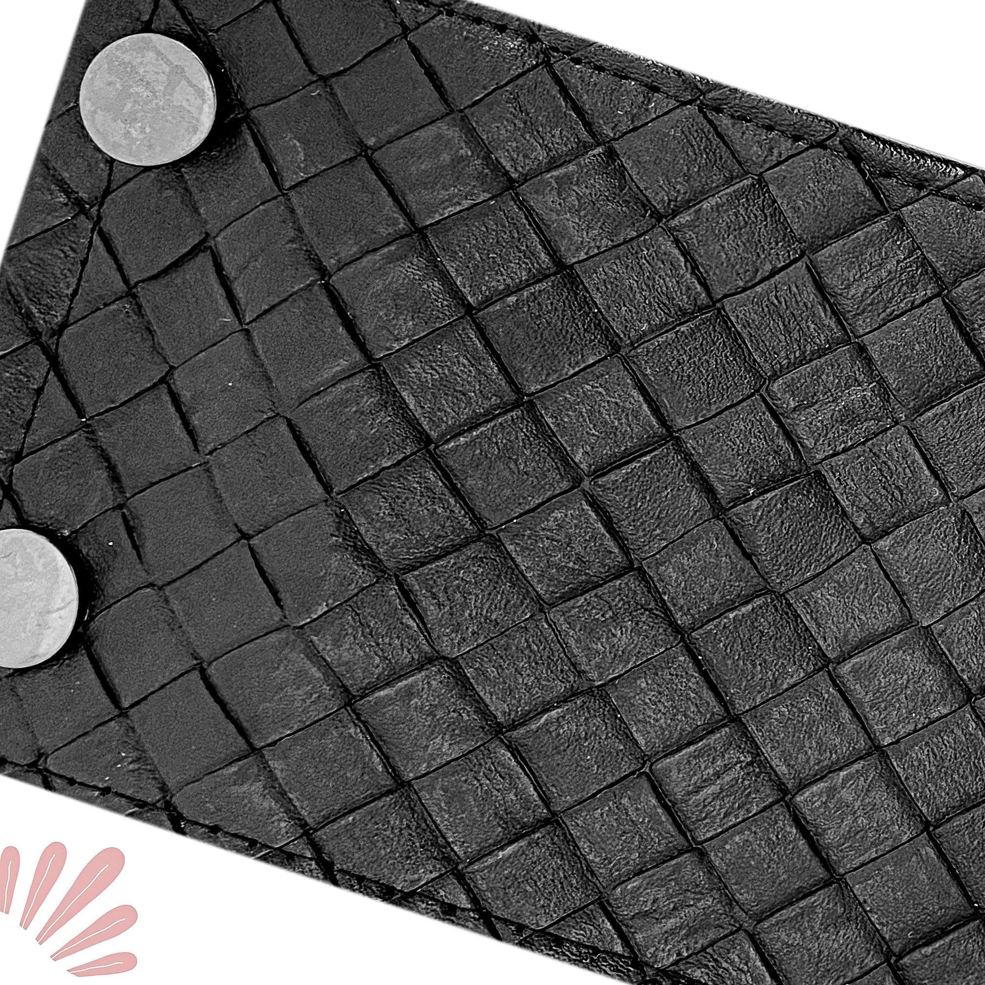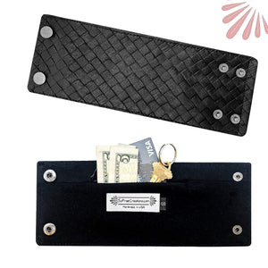 This Leather Cuff Bracelet is in fact a Thin Wallet. On the back, it has a secret pocket where you can stash Cash, Credit Cards, Badges, IDs and more. The material is 100% vegan and soft adding texture to the look. This weaved leather Black design is loads of fun.